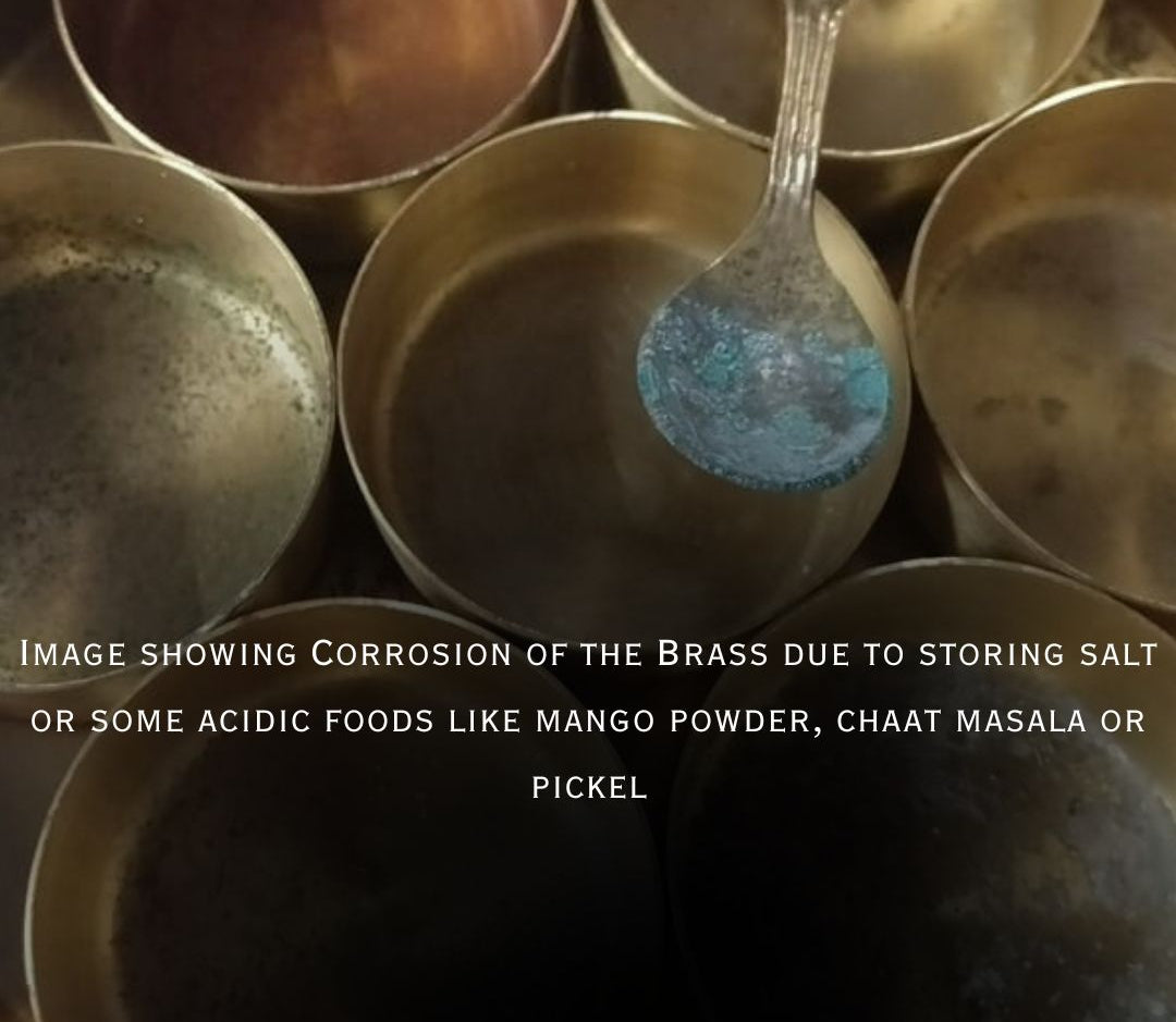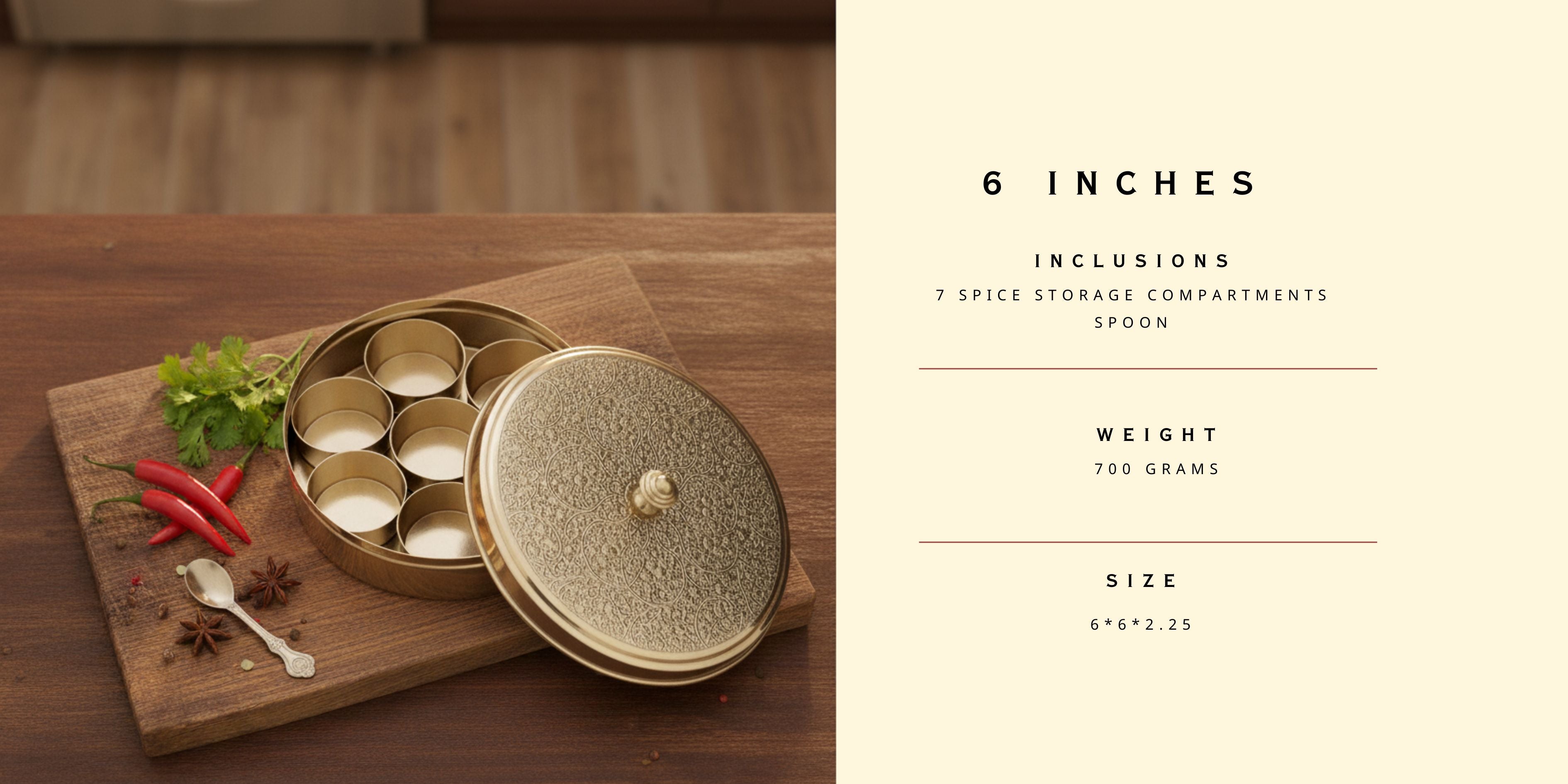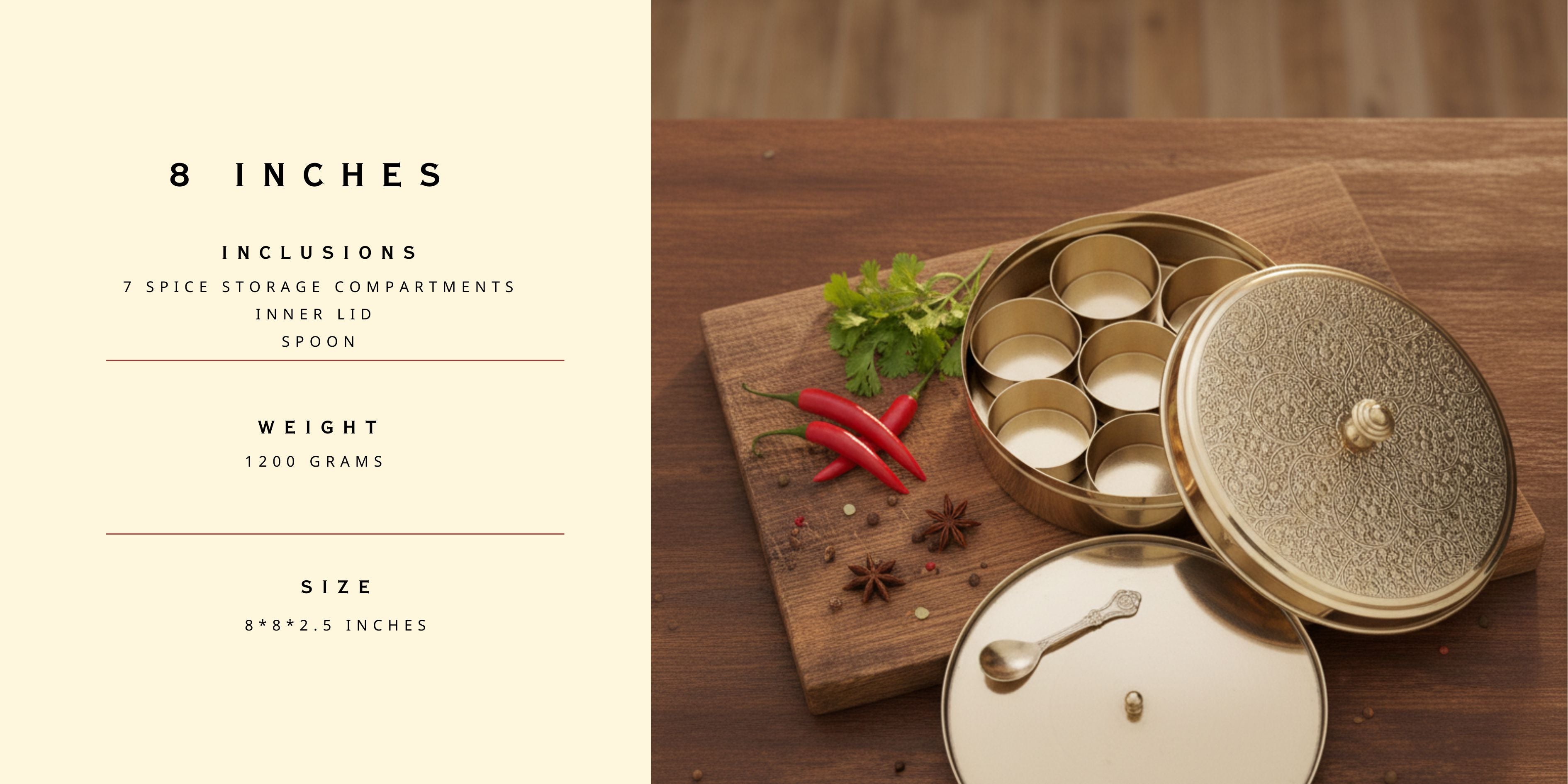 Box Contains: 1 brass masala box, 1 extra inner lid(Only in 8 inches), 7 spice containers and one spoon