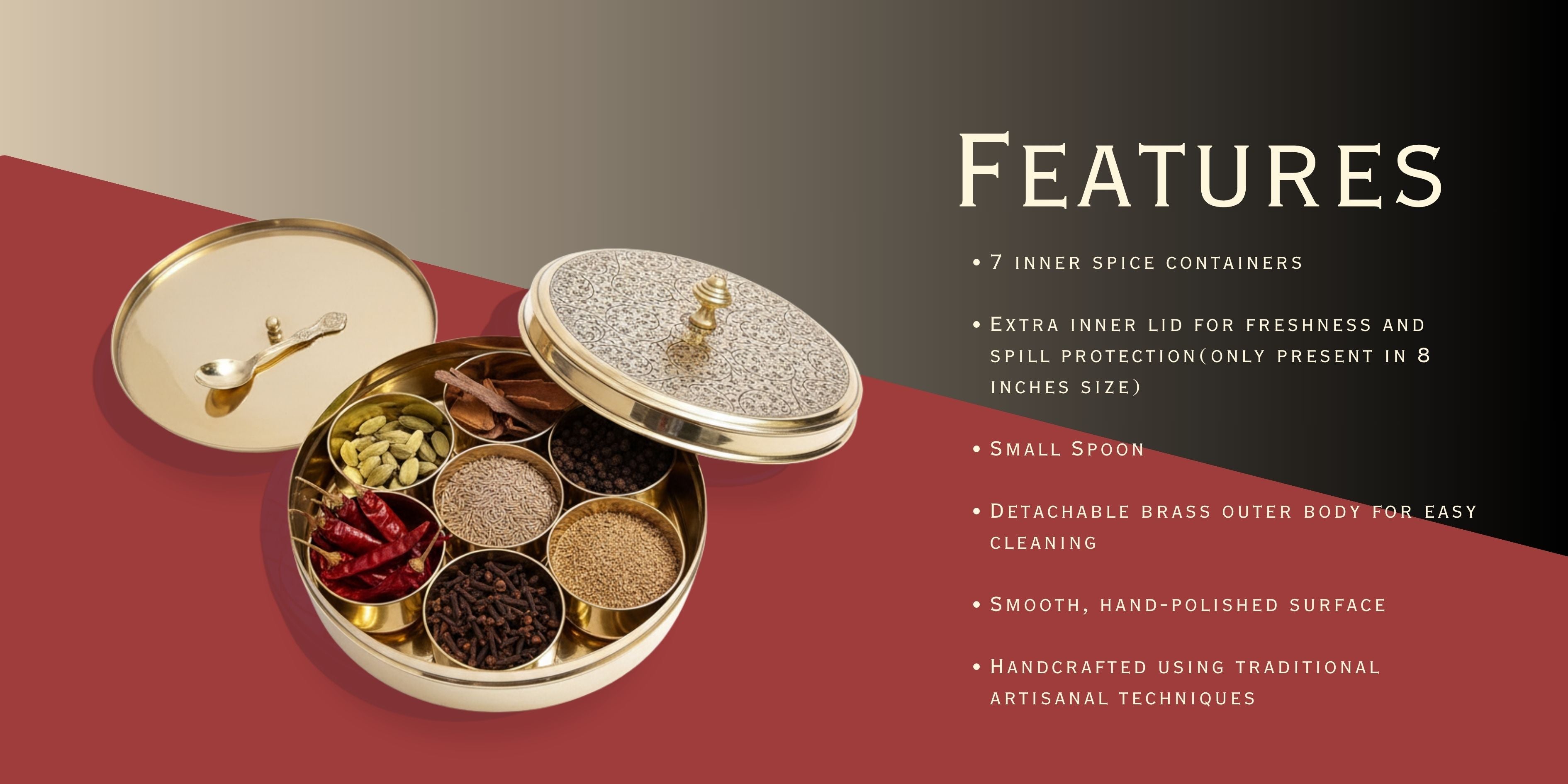 • The Design: Handcrafted from pure, food-safe brass, the box features a seamless design, keeping moisture and air out to ensure your spices remain fresh and aromatic. Includes 7 separate compartments and a snug-fitting lid.