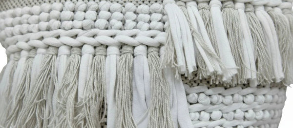 Cream embroidered luxury cushion covers with tassels placed beside a seated person.